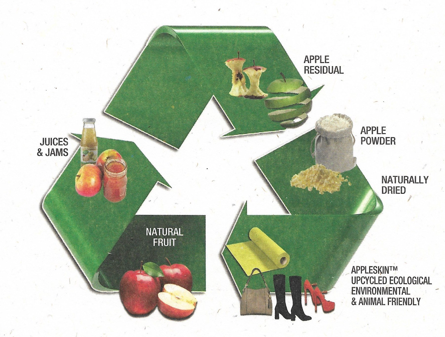 In the proces of making juice, there is a lot of pulp left which is usually thrown away. This pulp is dried and turned into powder. The powder is mixed with color pigments and binding material and spread out onto a canvas to become this leather like material.