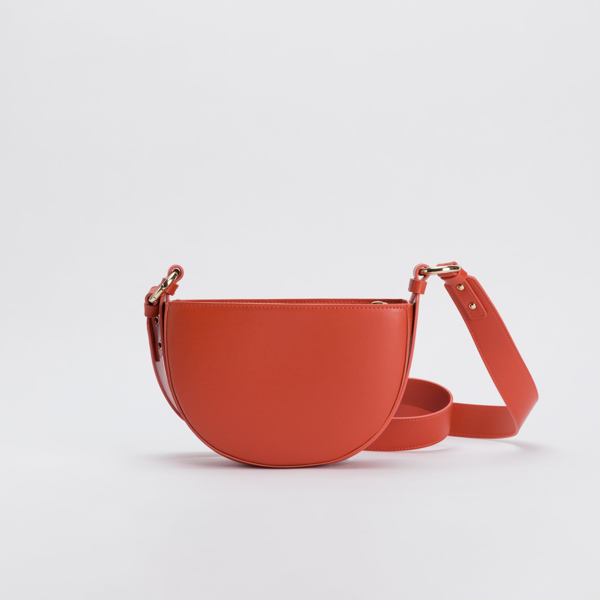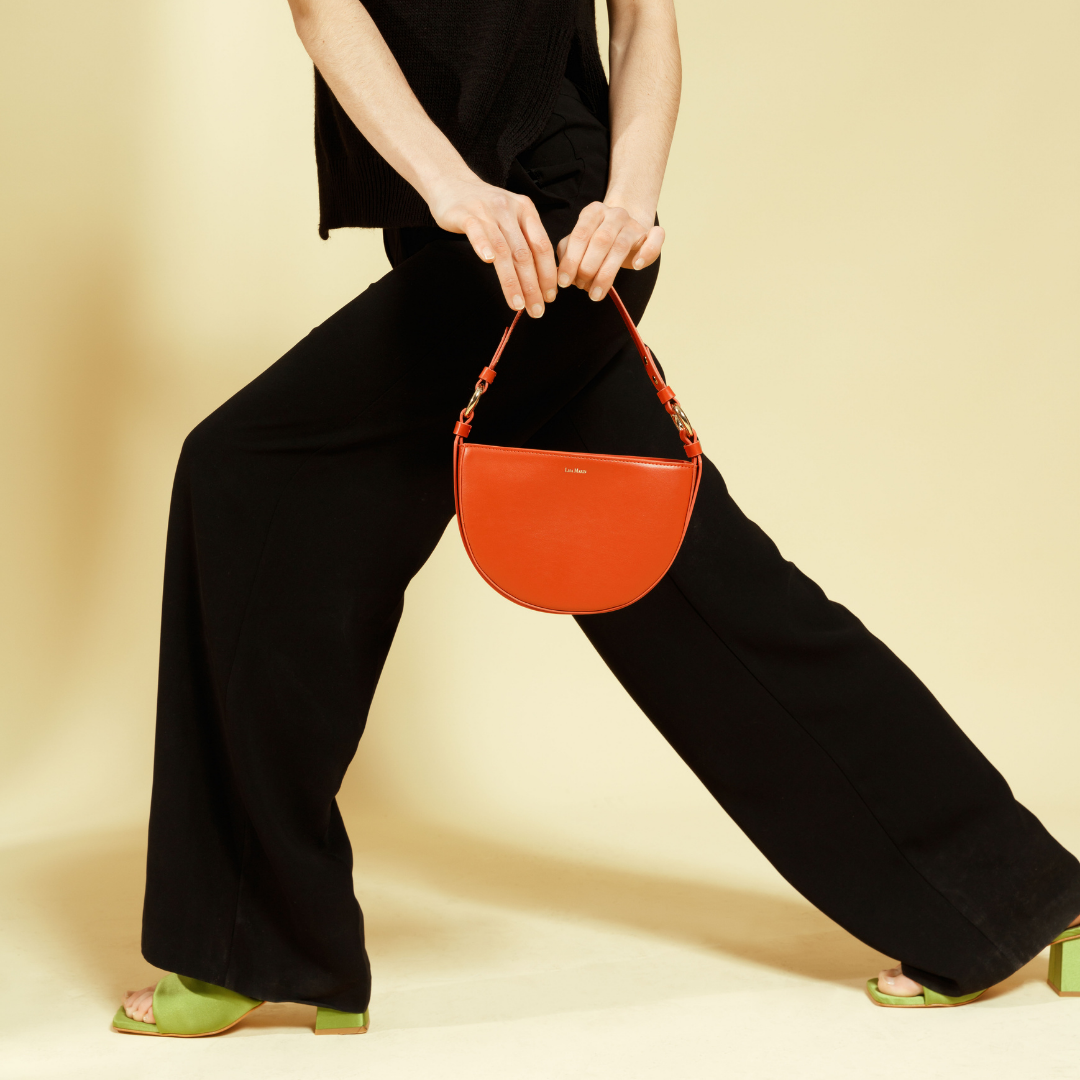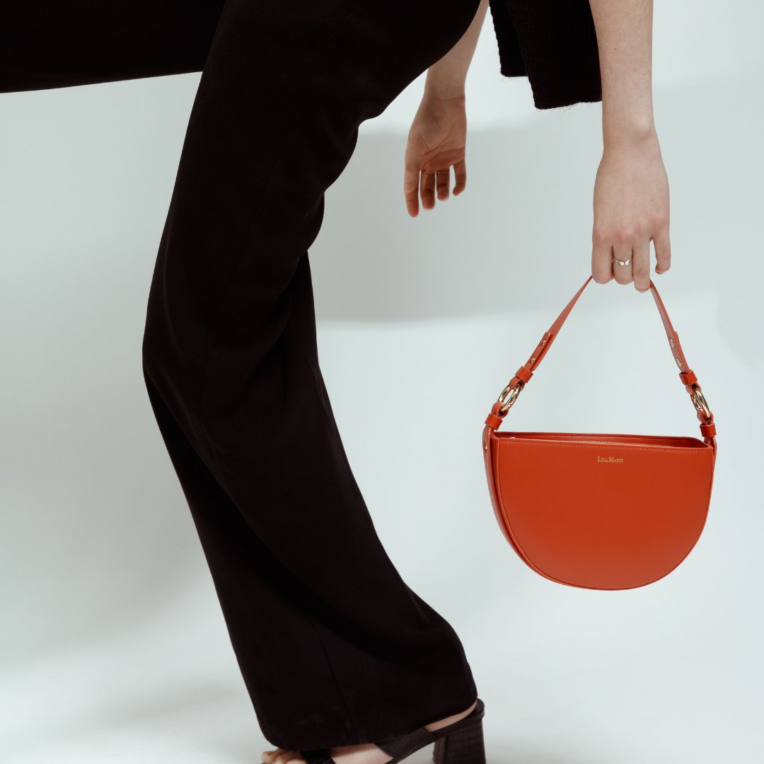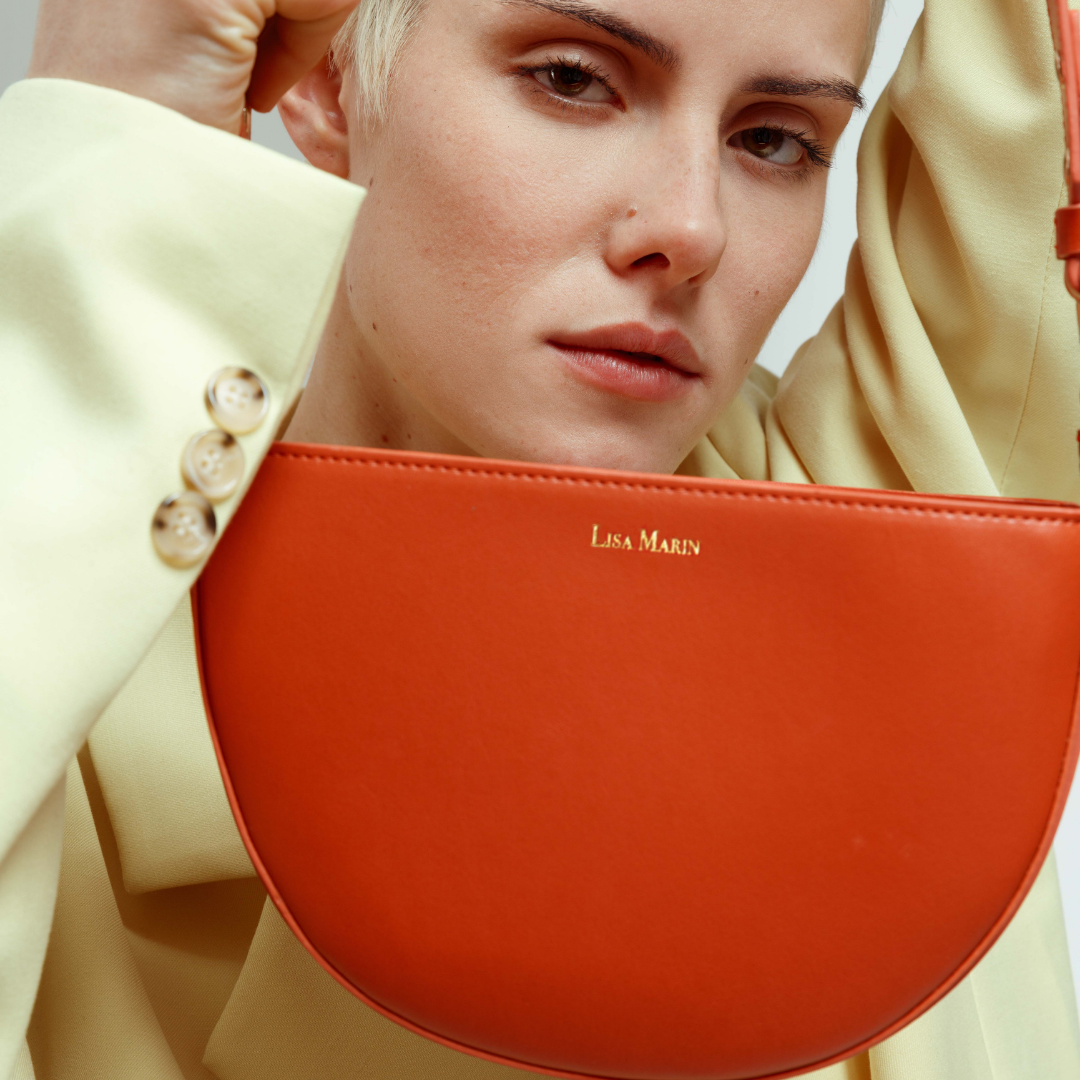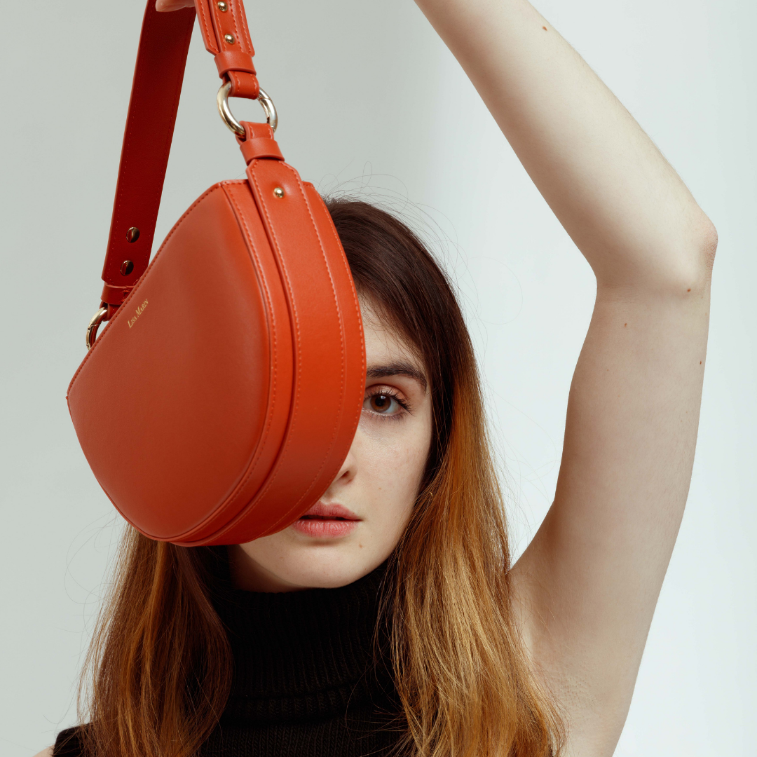This vegan bag is made with Apple skin in the most lovely color Burned orange. The inside is made with 80% recycled and 20% organic cotton. We have the Luna bag in Burned orange, deep black, and flat white.